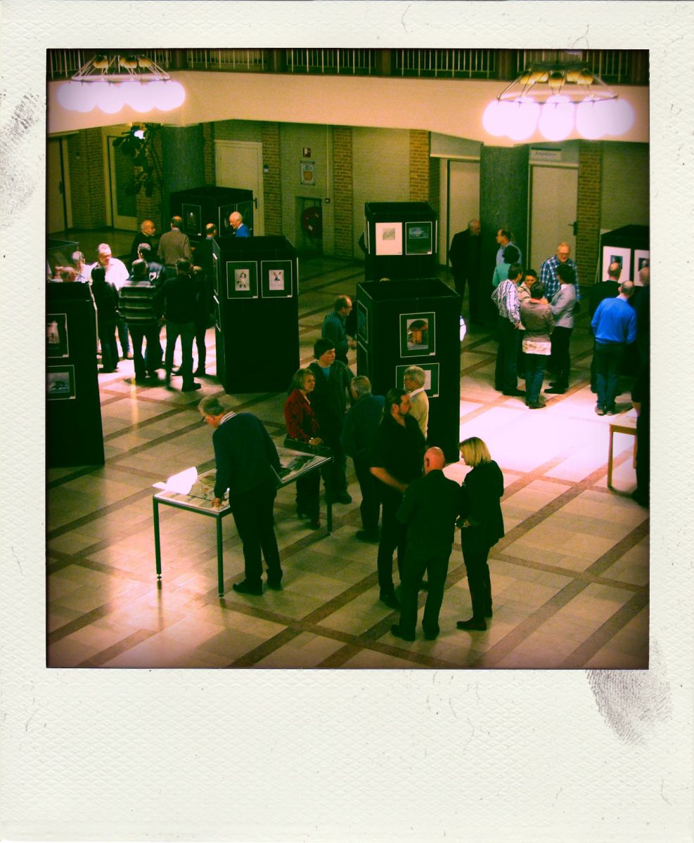 Overal staan groepjes mensen met elkaar te praten, over de foto's.