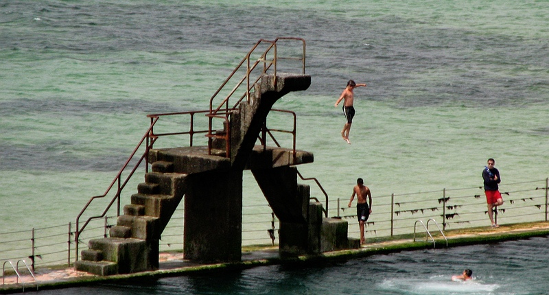 Wat je ziet is een openluchtzwembad net buiten de stadsmuren van het stadje St. Malo in Bretagne (Fr)