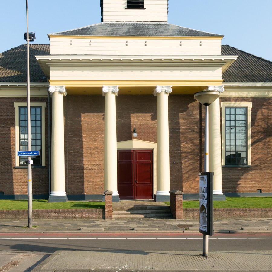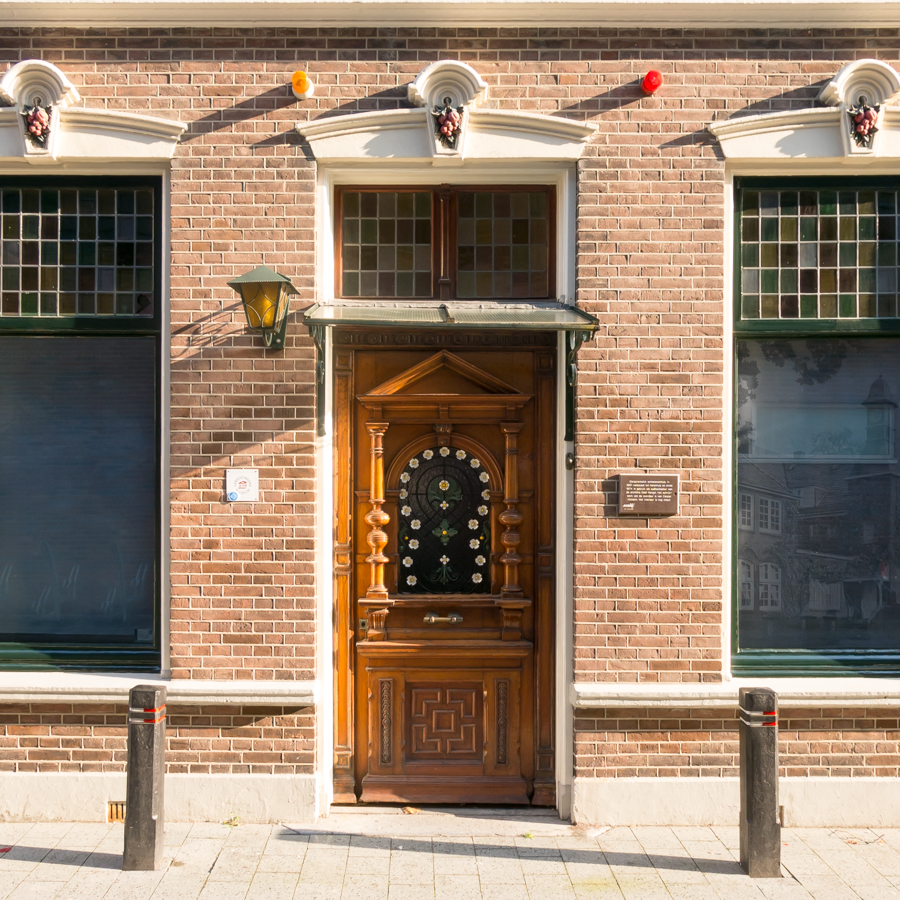 Een deur achter zuilen en daardoor ook iets statigs krijgend