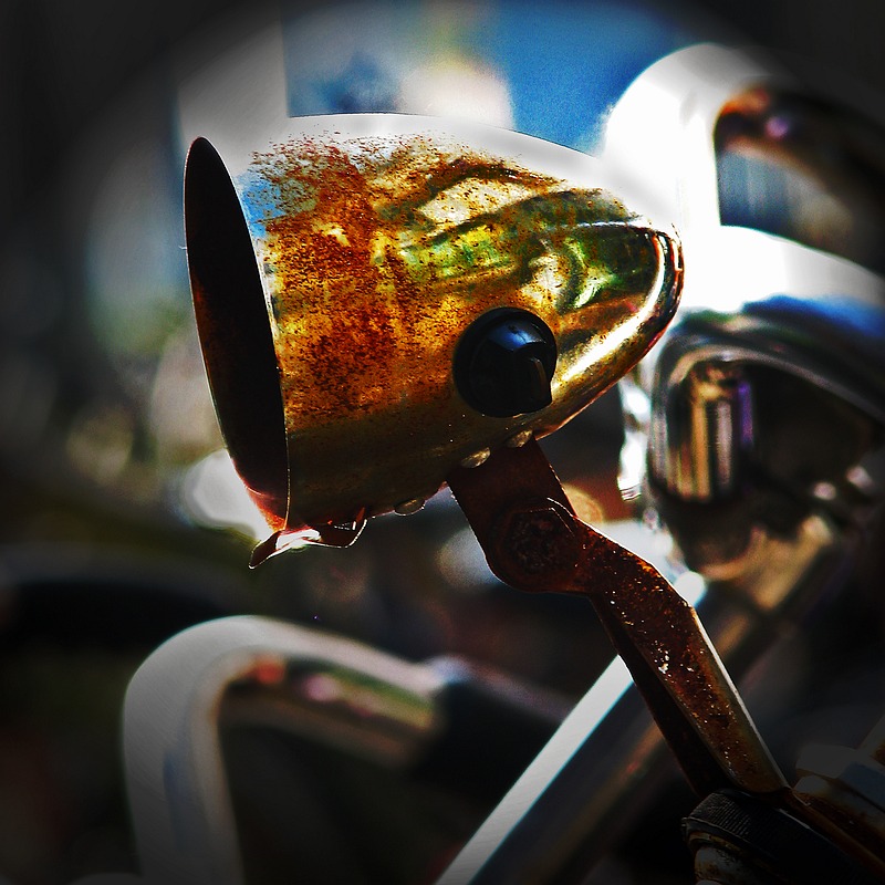 Foto 2 liet een danig verroeste fietskoplamp zien. Mooie kleuren, die mening werd gedeeld. Echter de verschillende lichte lijnen werden ook als (te) storend ervaren. Kan me daar wel in vinden. Tevens was het wit boven op de lamp naar mijn eigen oordeel bij de afdruk te grijs geworden.