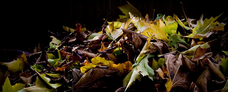 Het eerste onderwerp was verpakt in een foto van afgevallen blad, vol met herfstkleuren en verlicht door een late lage herfstzon. Ik zag ze liggen in de voortuin, opgewaaid tegen de muur die de tuin van de straat scheidt.