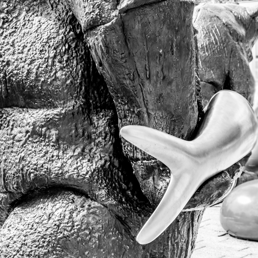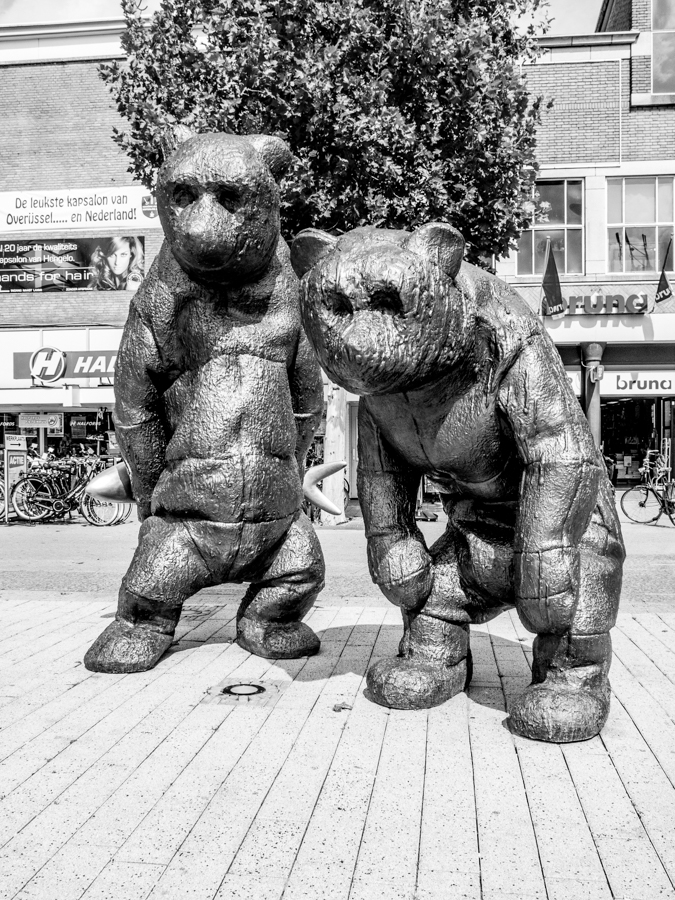 Het was even zoeken naar de juiste compositie. Maar uiteindelijk is het gelukt om niet het hele marktplein er op te krijgen en het verschil in structuur vast te leggen tussen het materiaal waar de beren van gemaakt zijn en die van de vis.