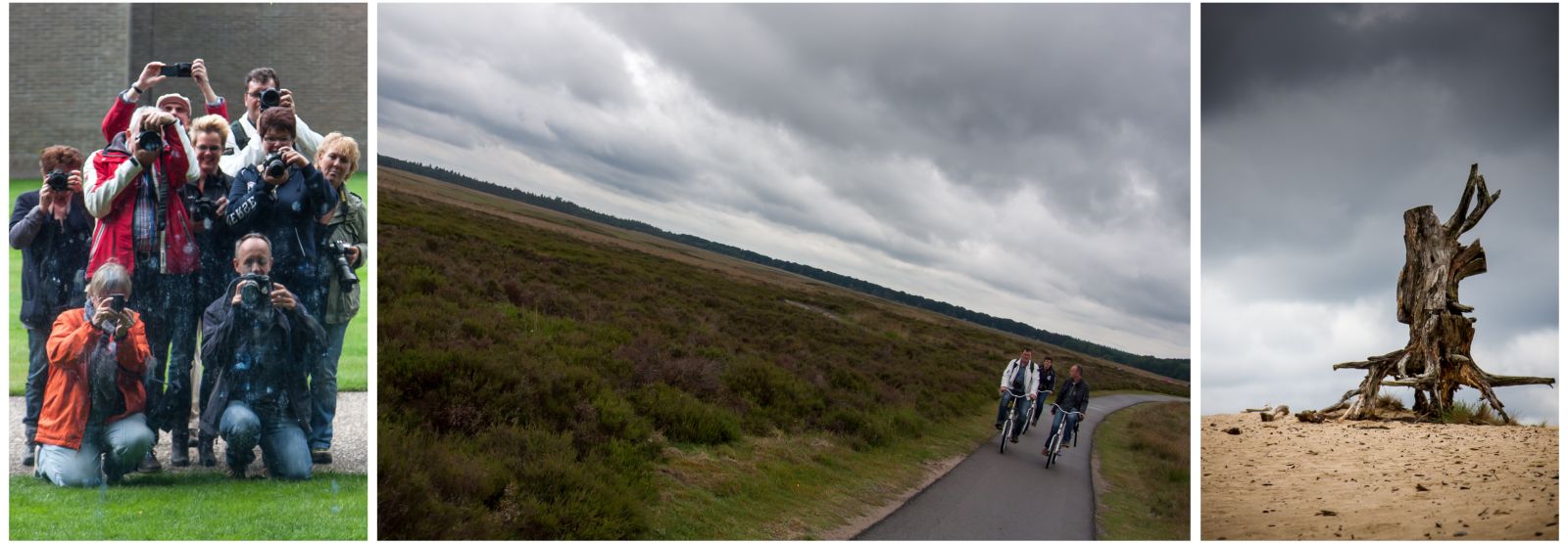 Het heeft de pret niet bedorven. Integendeel zou ik haast stellen. We hebben genoten van de meegebrachte broodjes, citroentaart, stukjes worst, koffie en fris. En of het zo mocht zijn bleven ons op de fietsroute zelf toch de nodige regendruppels bespaard. Die vielen voornamelijk terwijl wij de 'Van Goghs' bewonderden in het museum Kröller Möller. Of terwijl we ons verbaasden over de moderne kunst die te zien was en waarvan ons afvroegen waarom dat daar nu als kunst zou hangen. Tja kunst, als er niet over gesproken worden is het natuurlijk ook niet goed. Als mussen fladderden we rondom een object in bolvorm om die op allerlei manieren vast te leggen op de gevoelige chip. En vereeuwigden we - last but not least - ook menig museumbezoeker/ster.