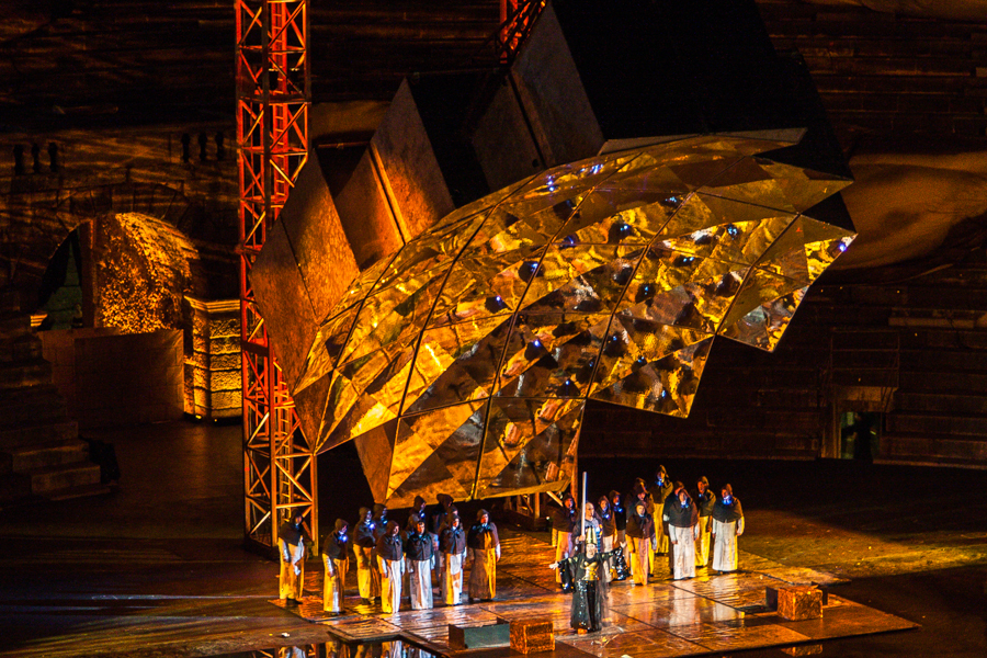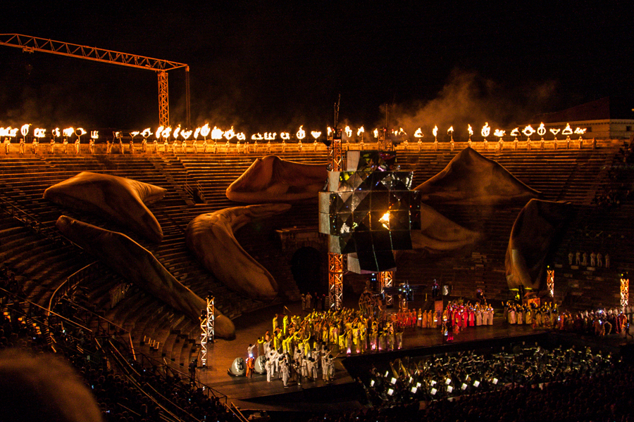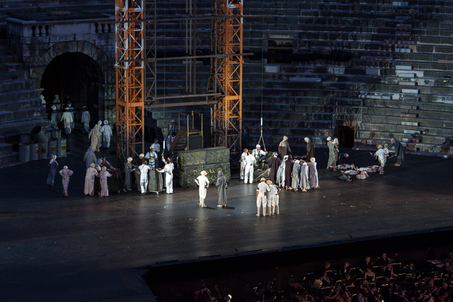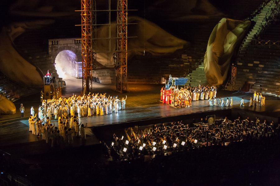 Achteraf geen spijt gehad. Niet dat ik nou overloop van enthousiasme voor de opera na dit bezoek. Stel je echter voor: een lome warme zomeravond, de ambiance van eeuwenoud Romeins theater met een capaciteit van ruim 20.000 bezoekers, de langzaam invallende avond, een inventief decor, bij tijd en wijle toch wel indrukwekkende prestaties op het toneel met misschien wel 200 ! acteurs. Hierbij werd niet alleen het podium maar ook het hele theater gebruikt - op een gegeven moment kwam een groep spelers gewoon tussen het publiek opduiken.
