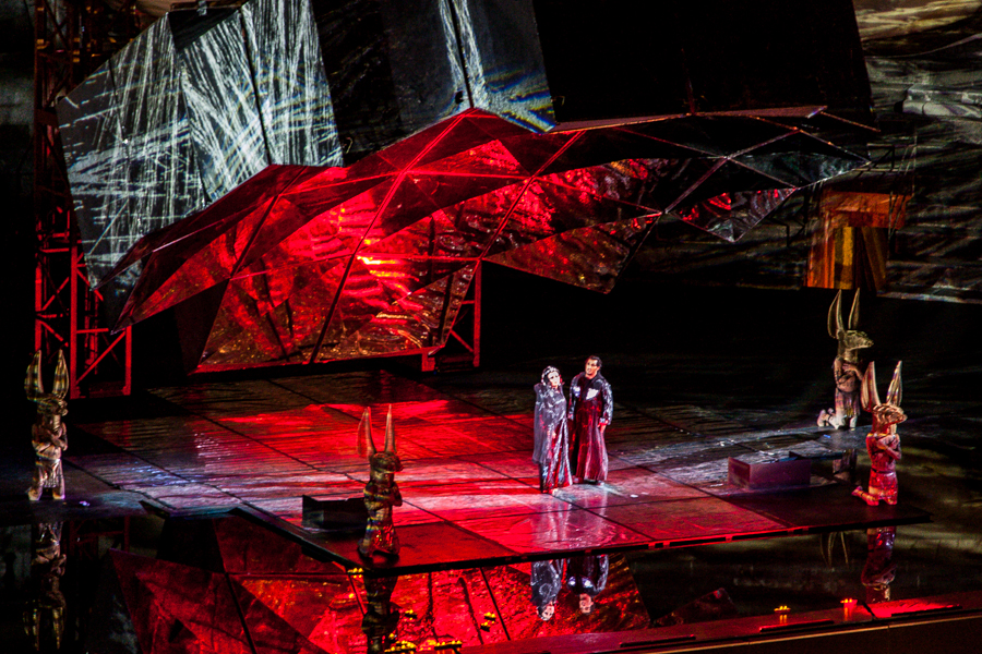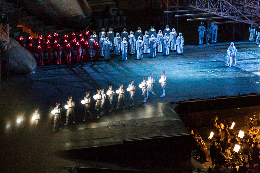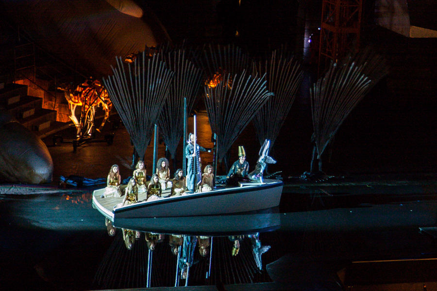 En een eigentijds ingevuld verhaal. Hoewel zich afspelende in de oudheid in Egypte kwamen heftrucks, Segways en nog meer gemotoriseerd vervoer voor in het stuk. Tijdens de uitvoering werd met kranen nog een groot deel van het verder in het stuk te gebruiken decor opgebouwd (de spiegels in de foto's hieronder)